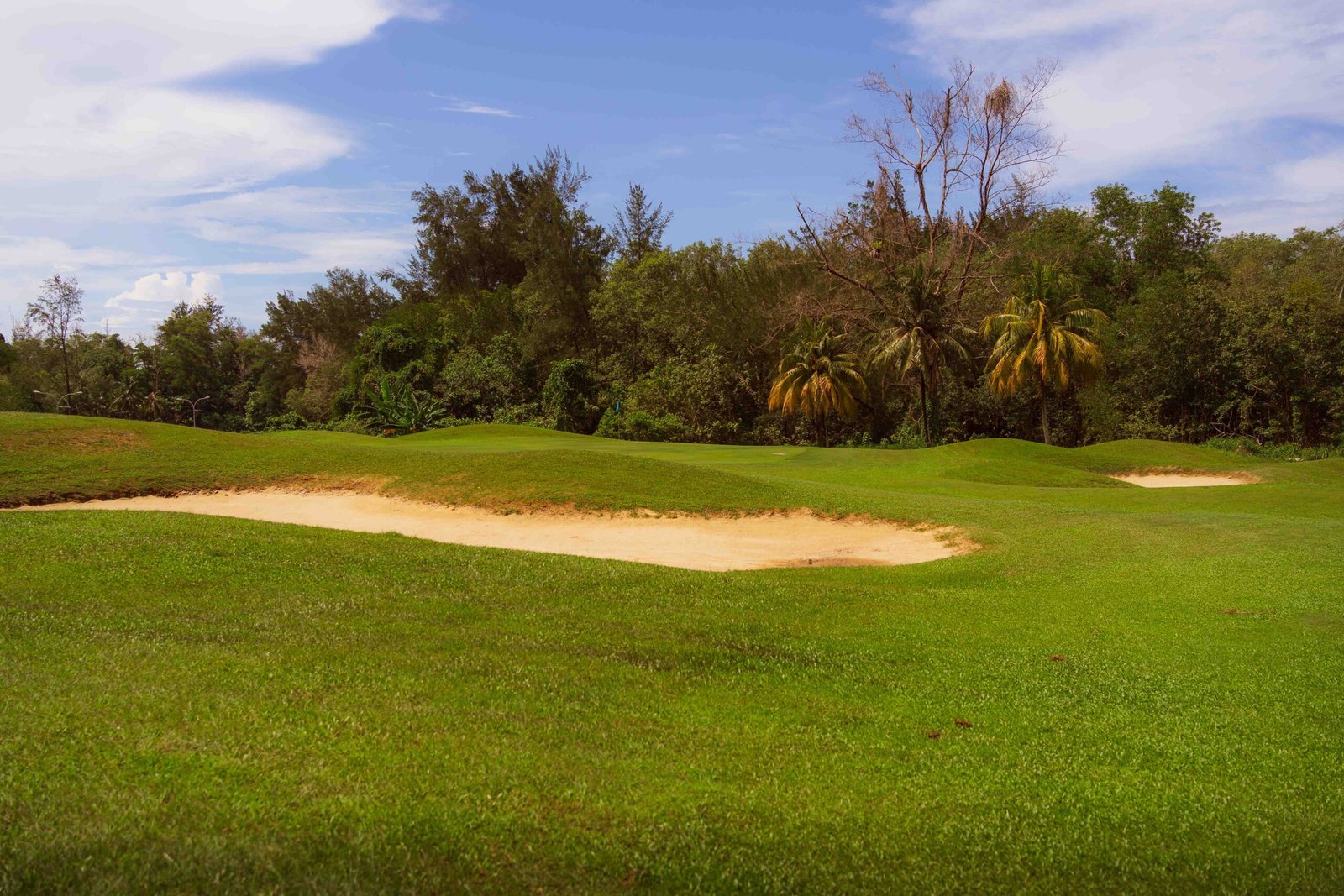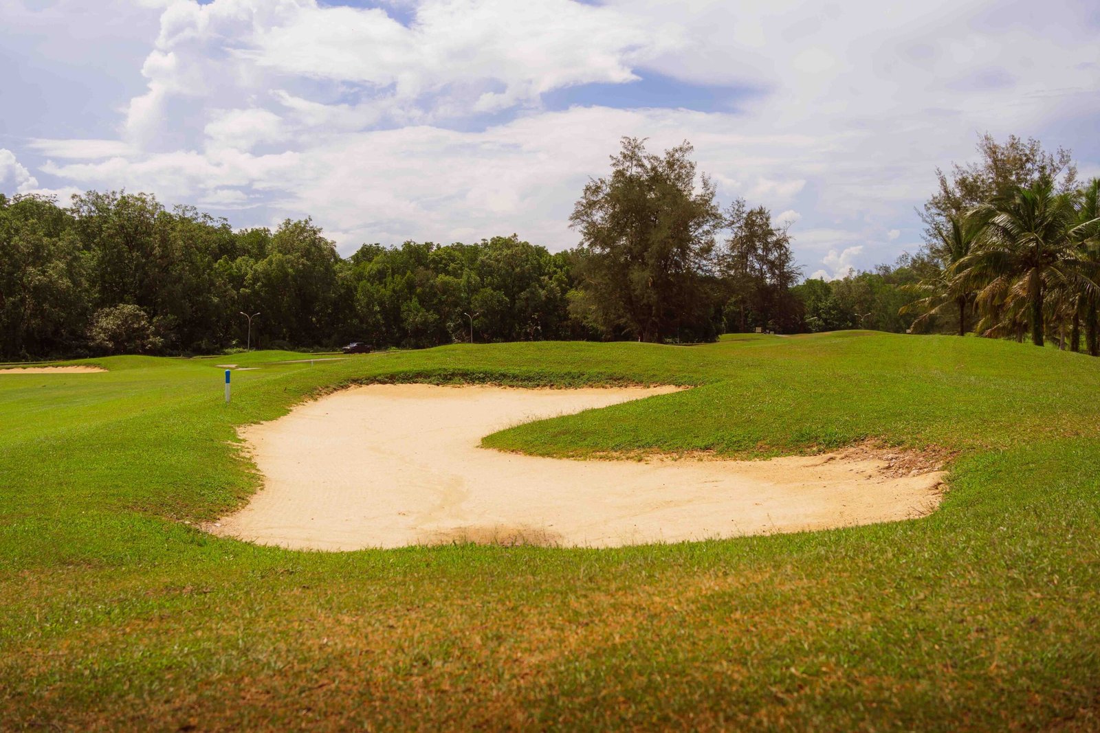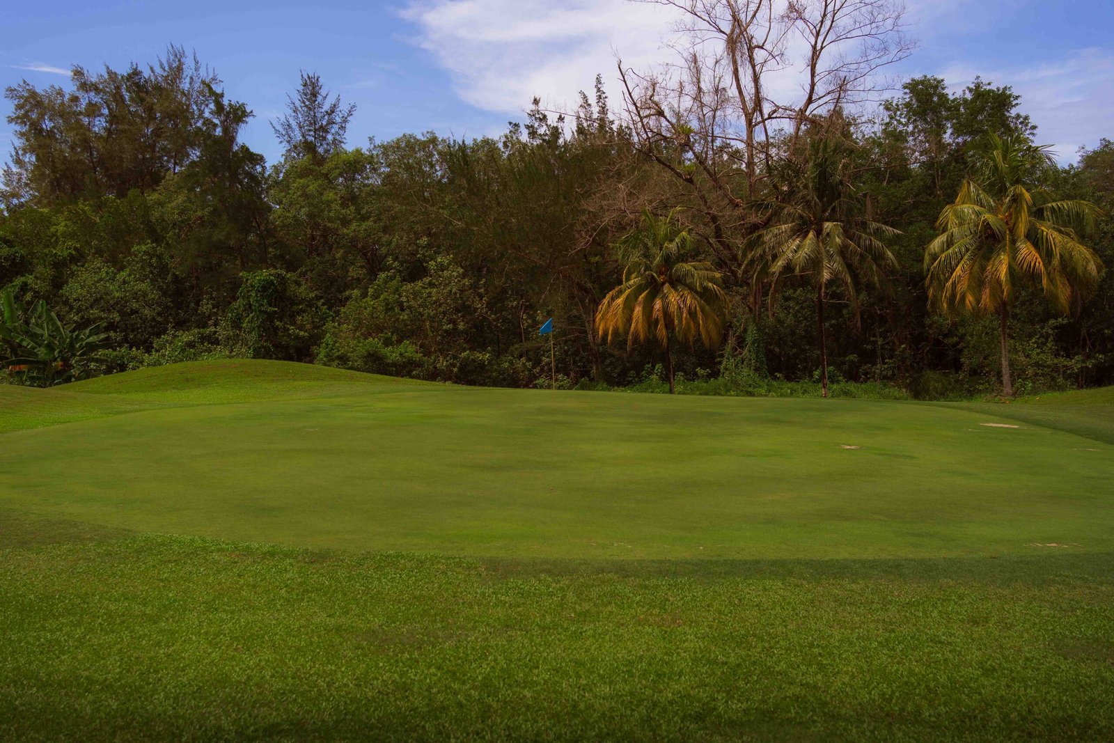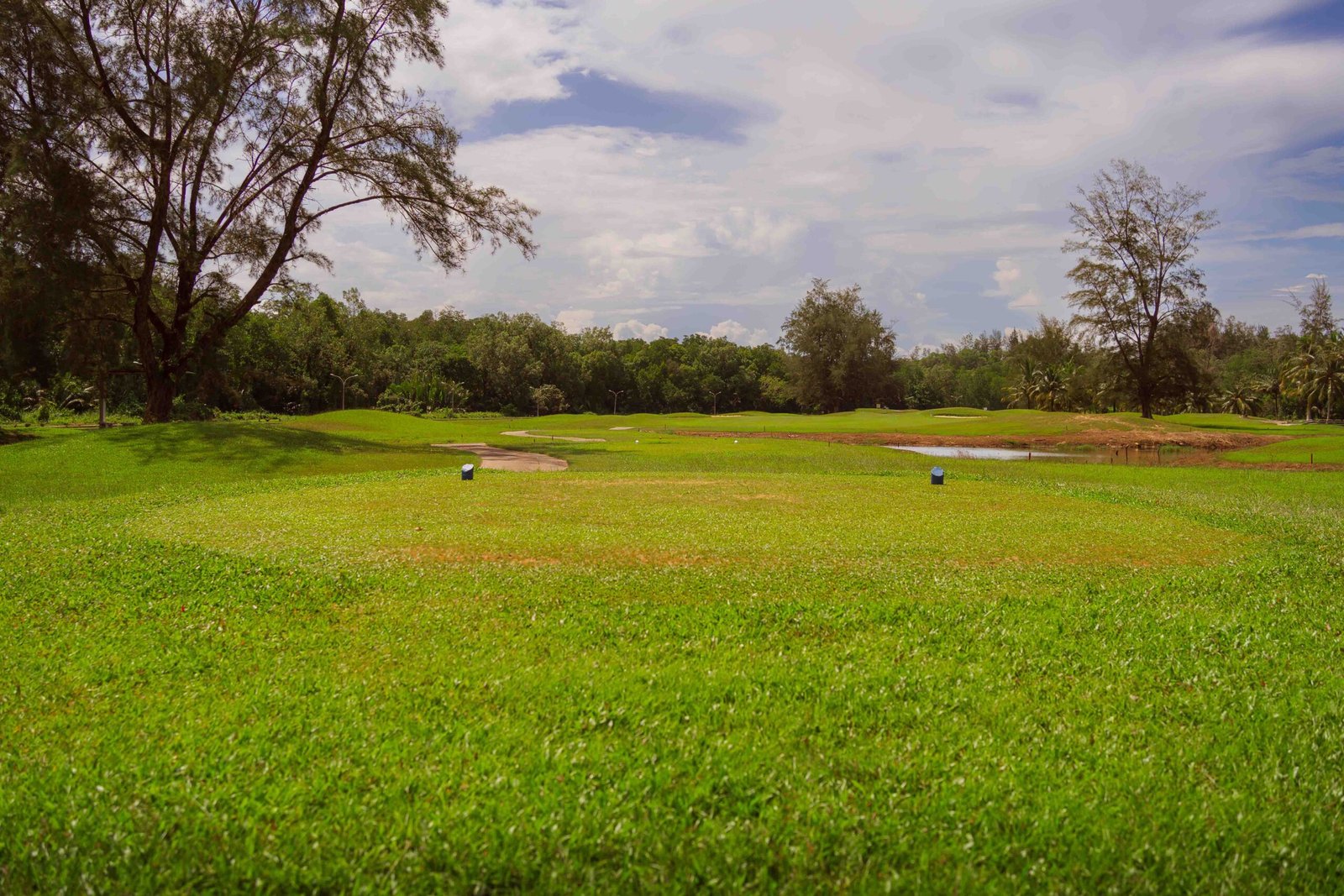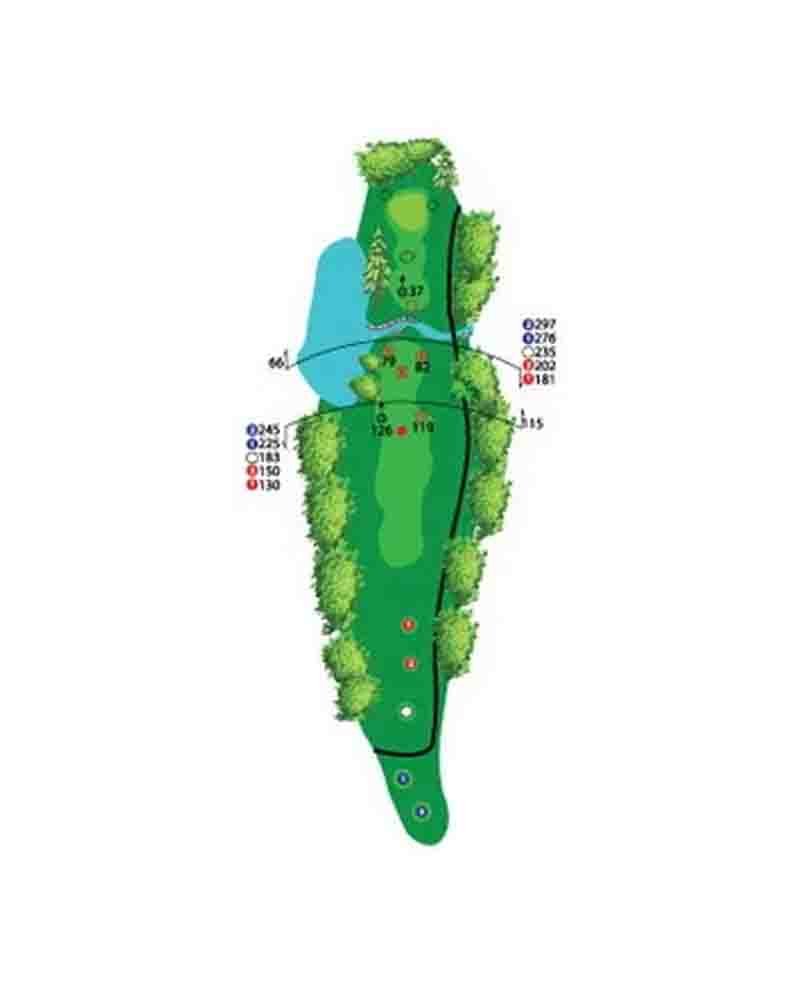 At 418m, this long Par 4 requires two powerful, accurate shots. The fairway is tightly framed by trees on both sides, with an Out of Bounds (OB) line running along the right. A water hazard cuts across the fairway approach, forcing a carry or a strategic layup. The green is relatively open at the front but is bordered by a water hazard on the left and thick trees behind, making club selection crucial in the ocean breeze.