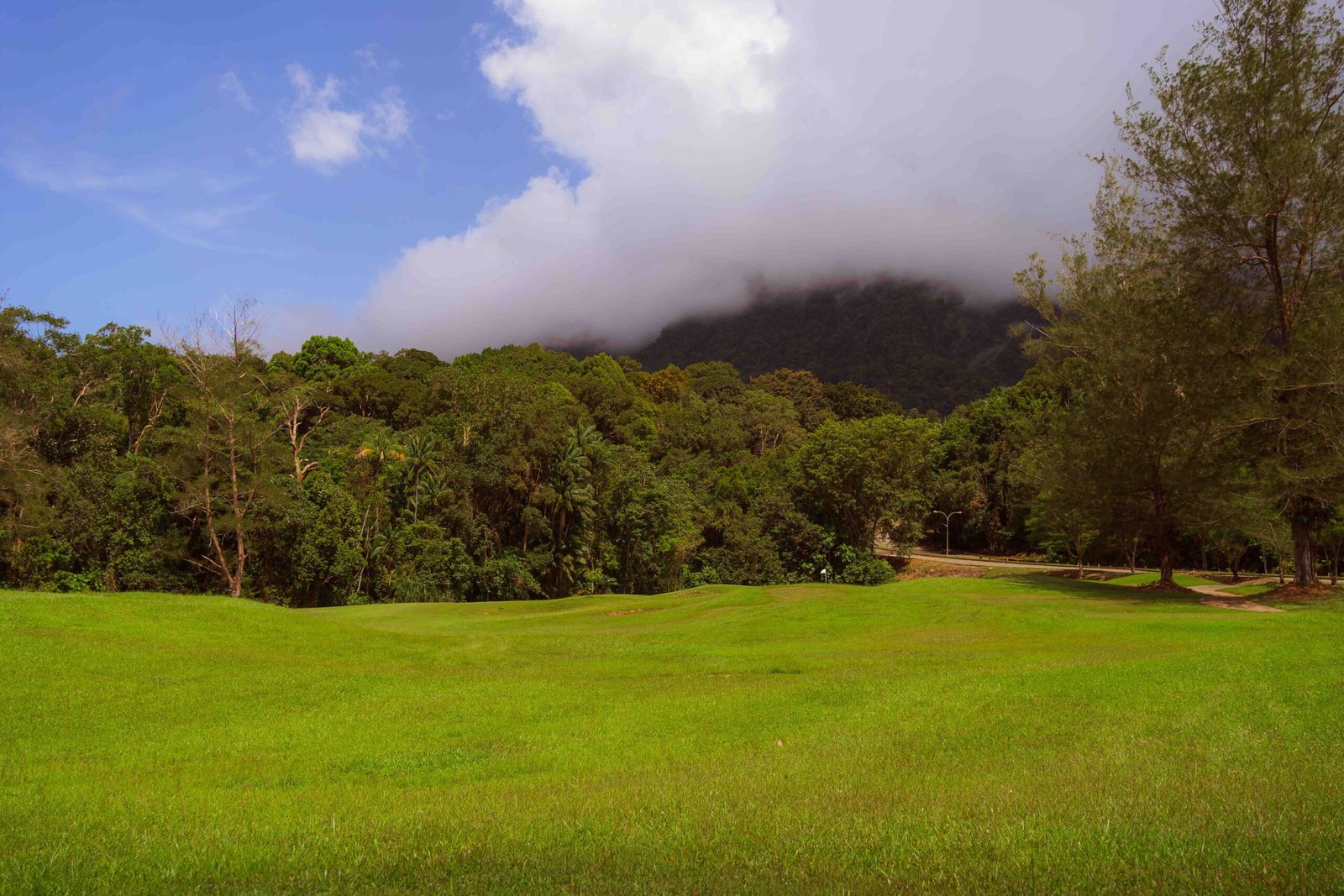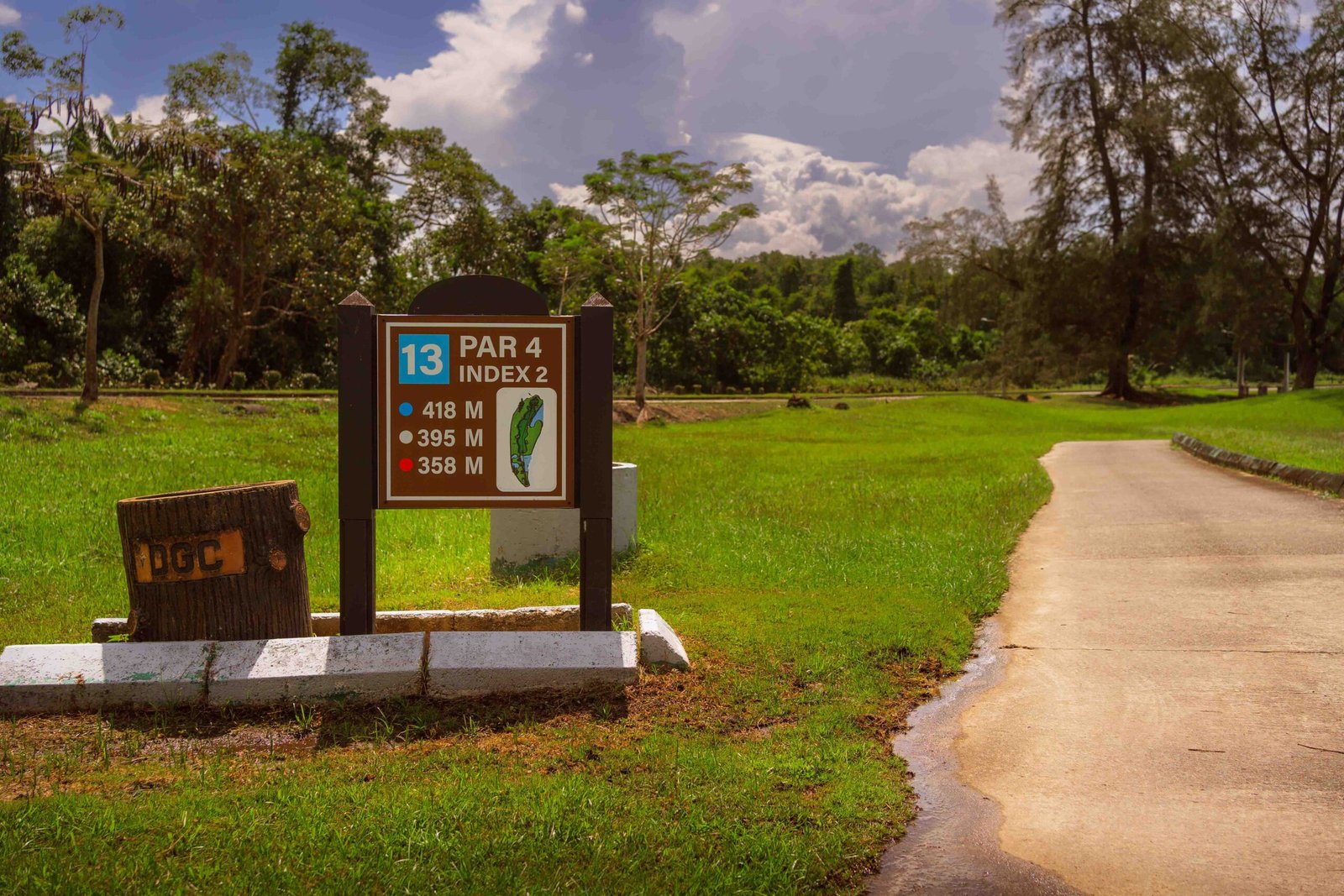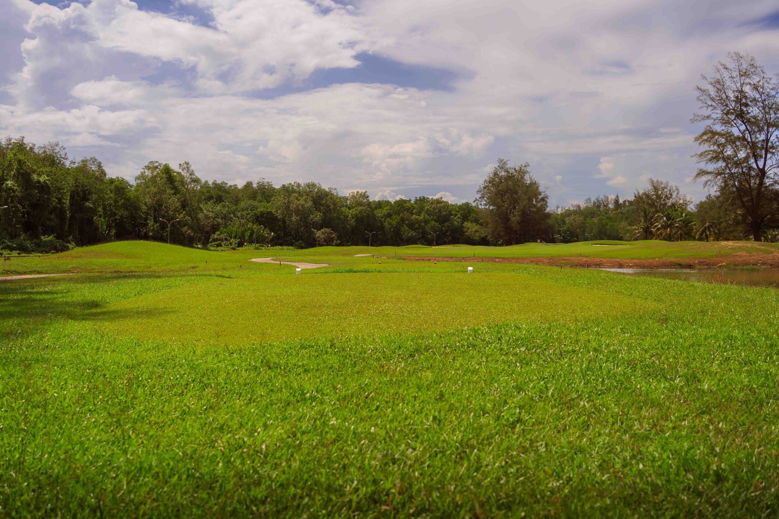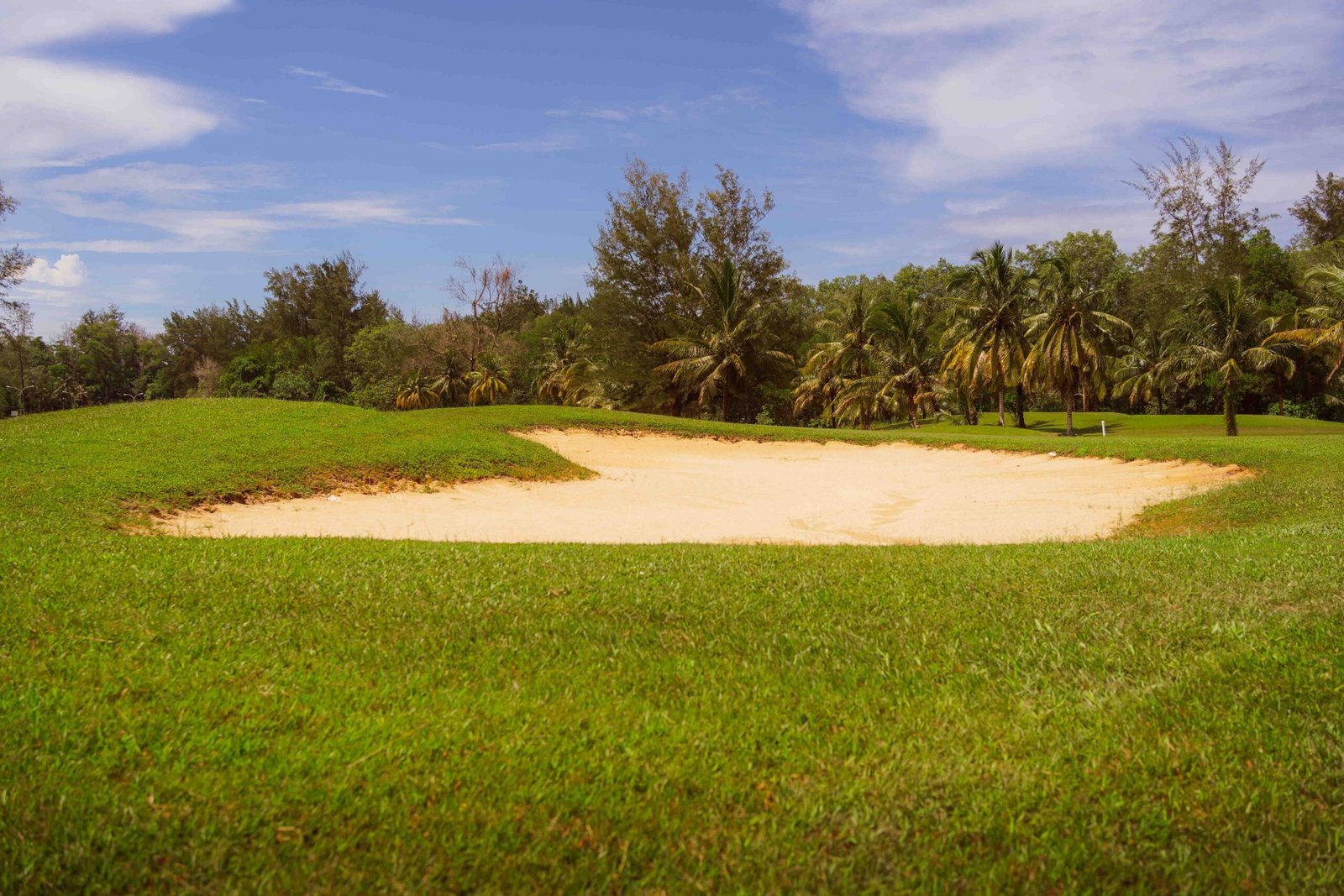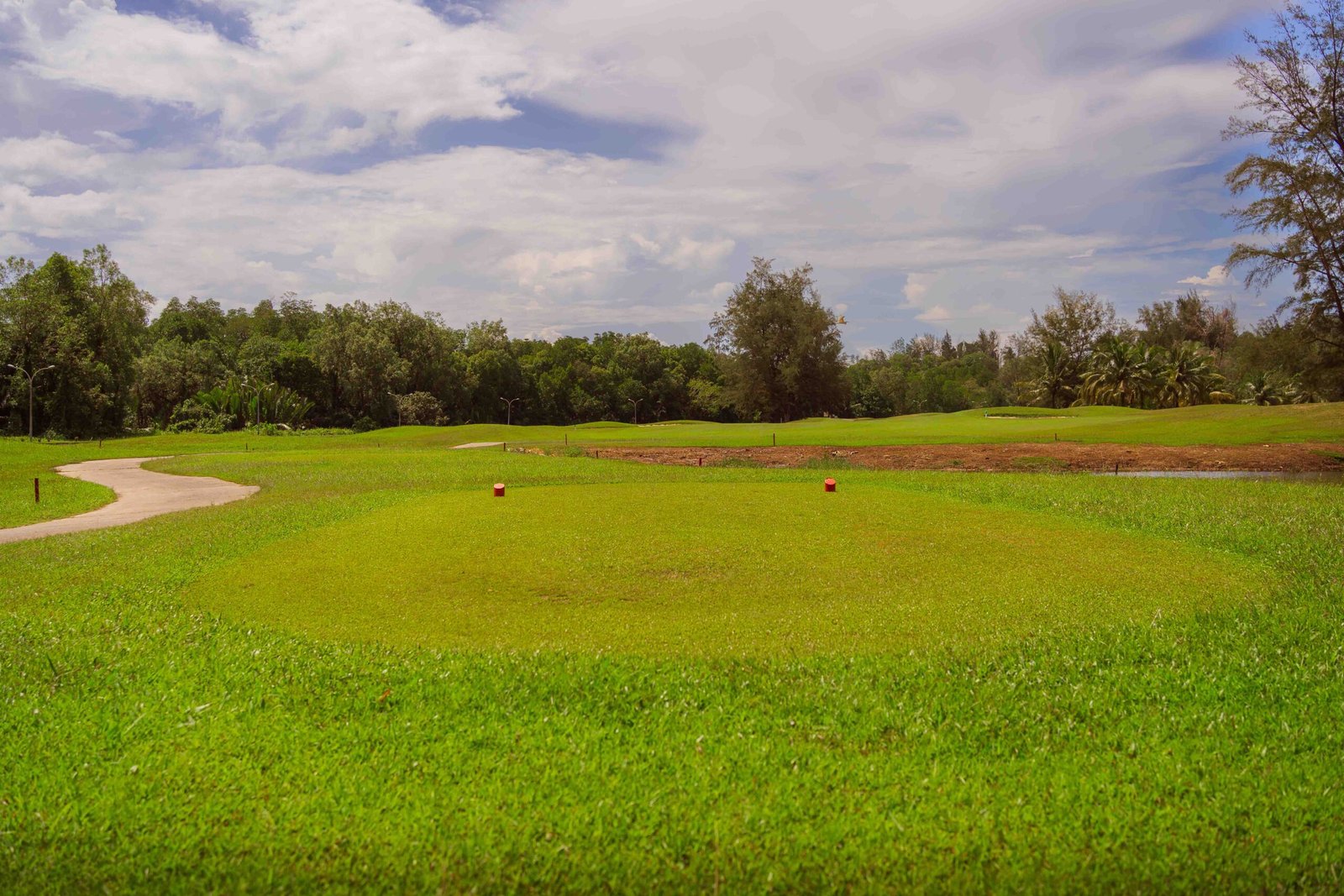 At 418m, this long Par 4 requires two powerful, accurate shots. The fairway is tightly framed by trees on both sides, with an Out of Bounds (OB) line running along the right. A water hazard cuts across the fairway approach, forcing a carry or a strategic layup. The green is relatively open at the front but is bordered by a water hazard on the left and thick trees behind, making club selection crucial in the ocean breeze.
