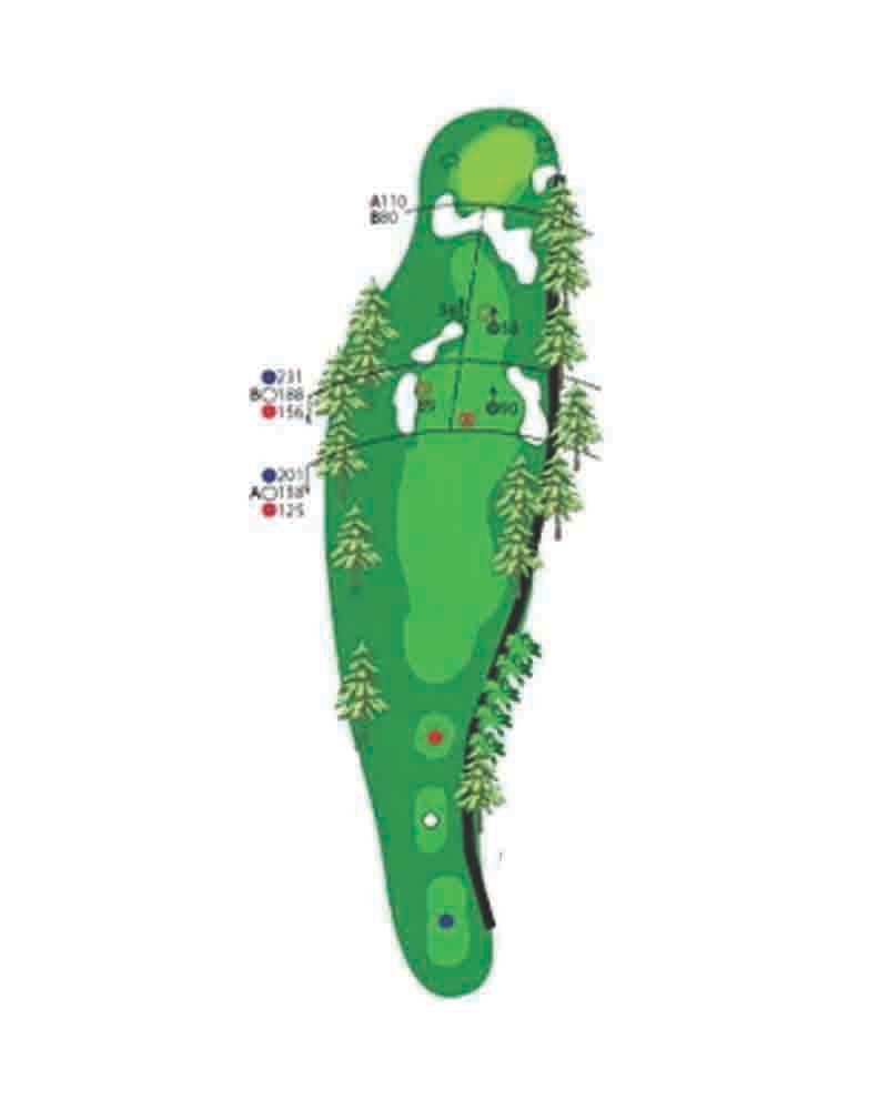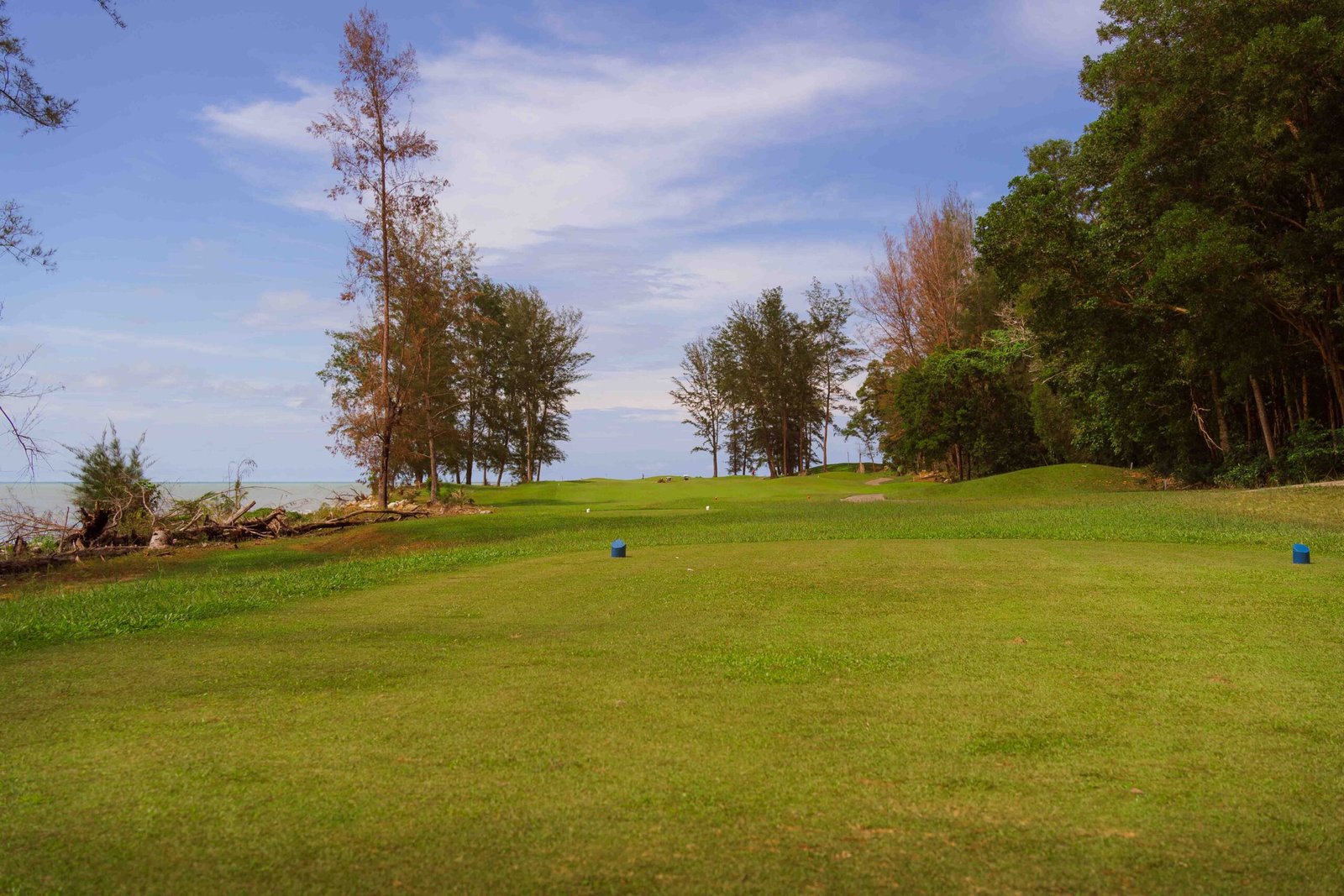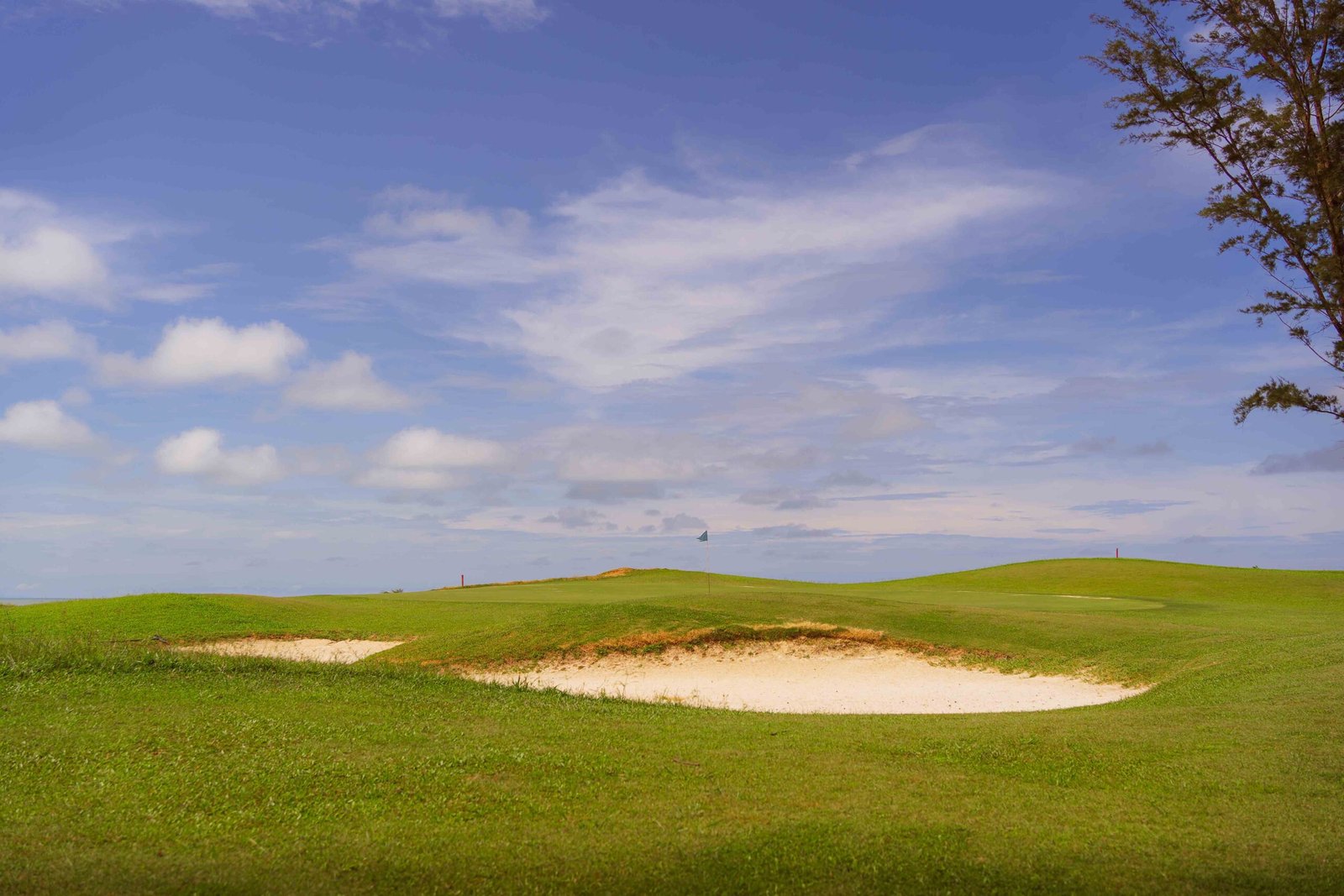 This 358m Par 4 is a test of bunker navigation. The fairway is pinched by a large bunker on the left and another on the right, requiring a precise drive through the gap. Thick clusters of trees line the entire left side, while the right side features an Out of Bounds (OB) boundary. The approach shot is equally daunting, with a deep bunker guarding the front-left of the green. Accuracy and club selection are paramount to finishing this seaside hole at par.