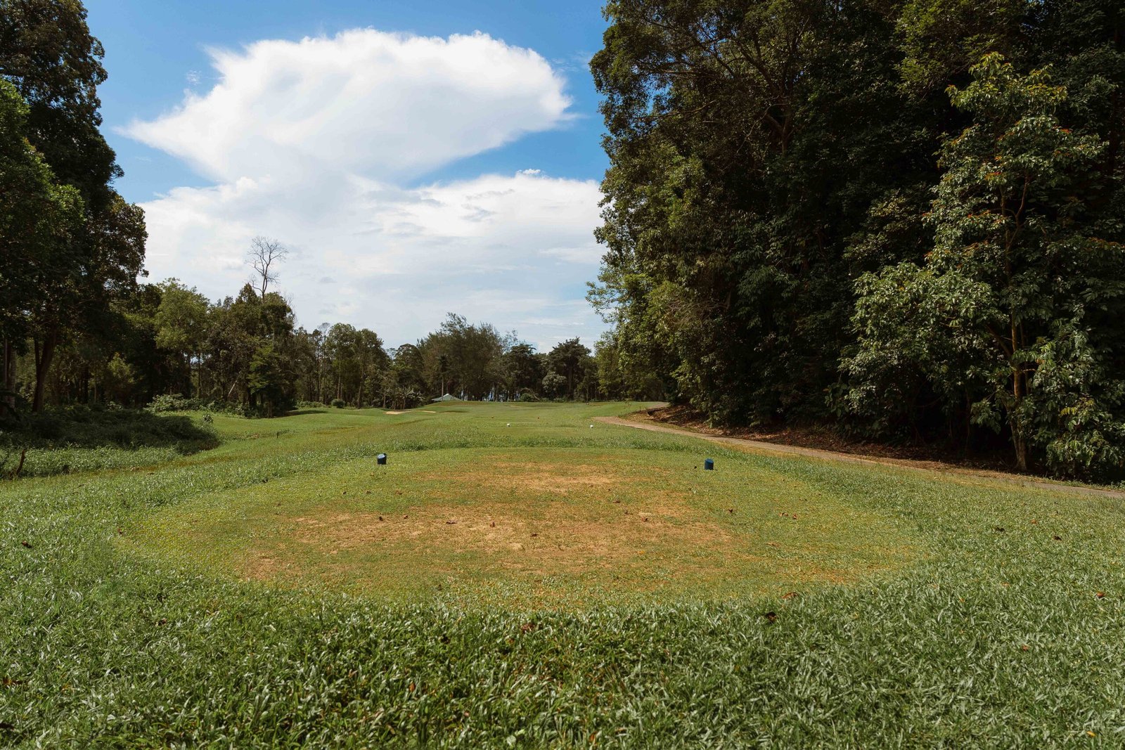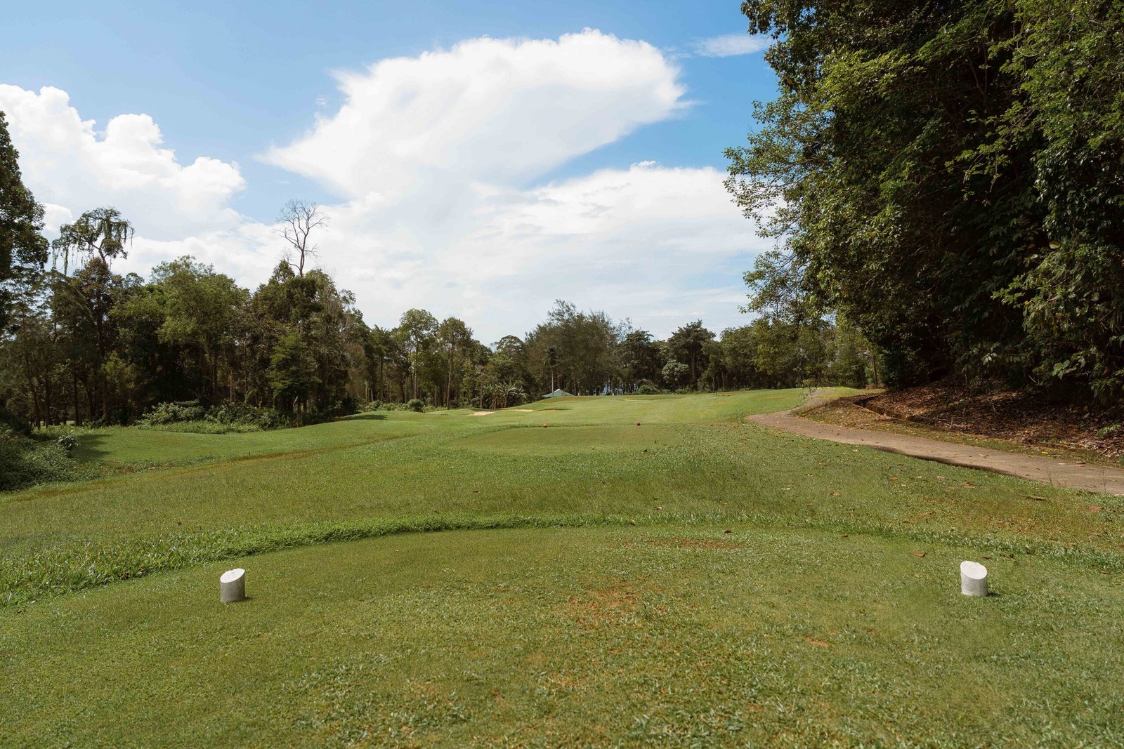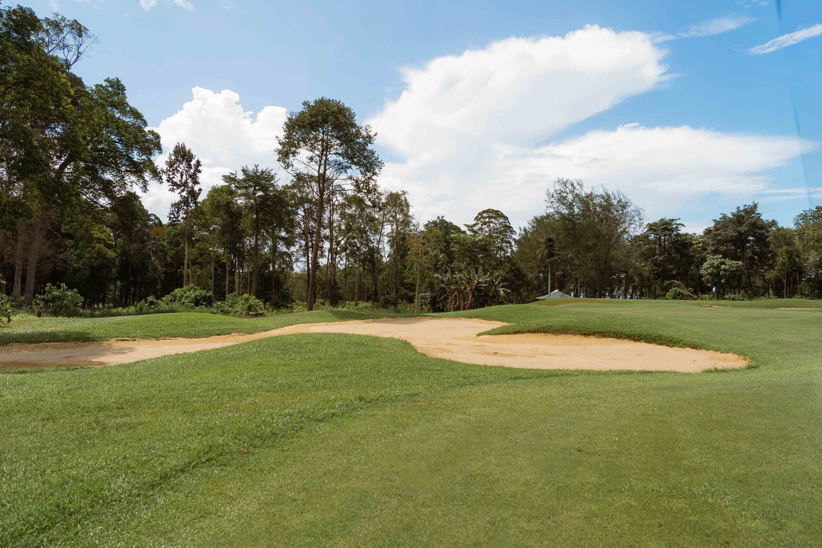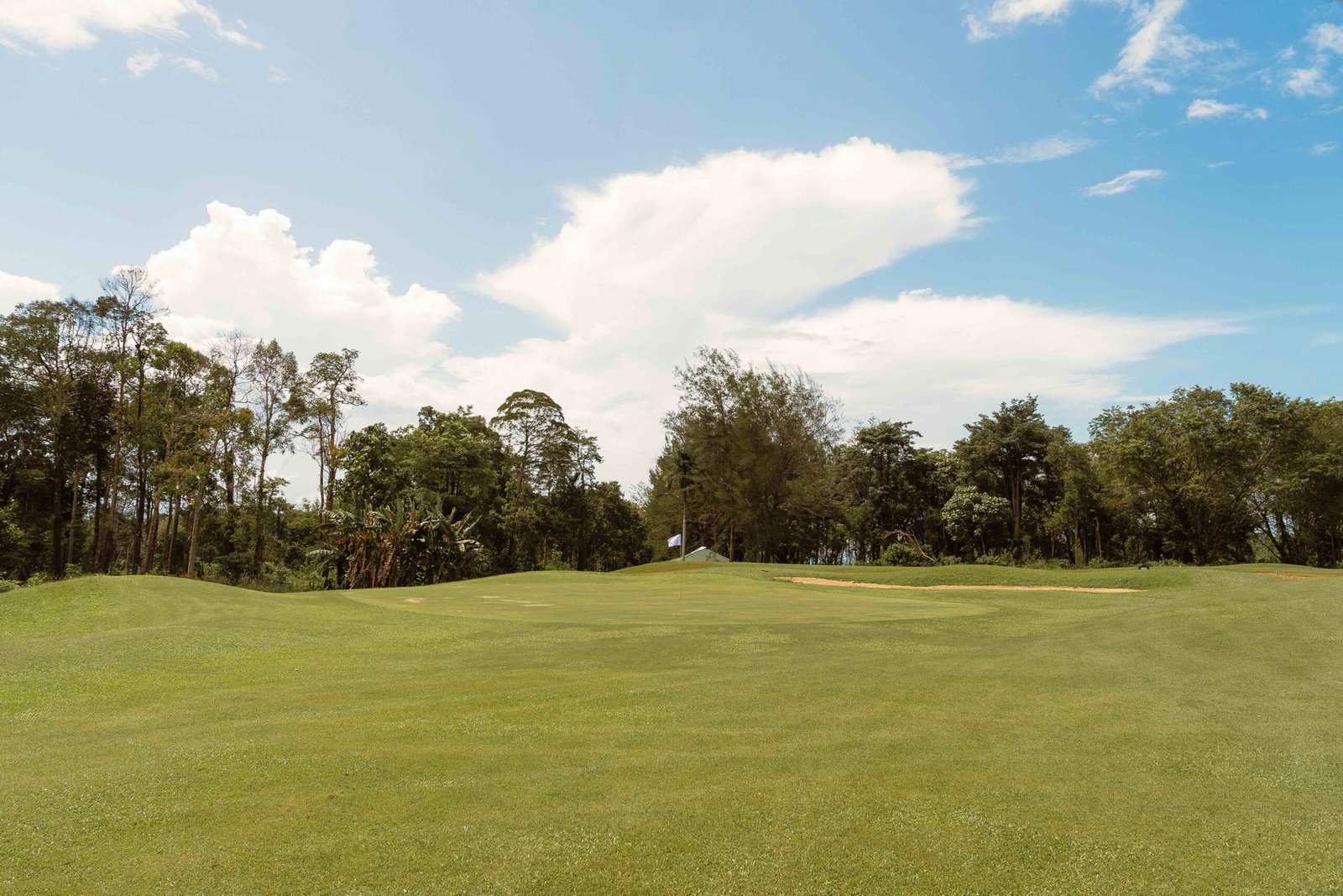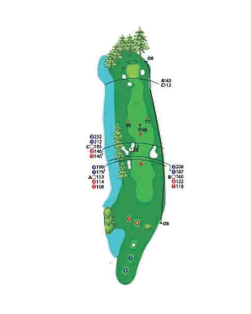 Set against the rugged mountain terrain, this long Par 3 demands a precise long-iron or wood. Water lines the left side of the hole, while the right is protected by a continuous OB boundary. The green is heavily fortified, featuring two bunkers at the front-left and one large bunker on the right. Club selection is critical for this 200m shot, as players must also navigate a cluster of trees guarding the back of the green.