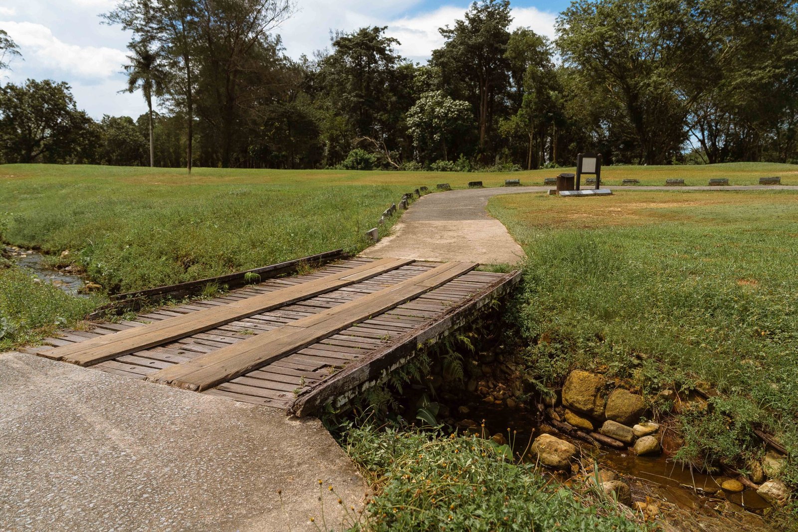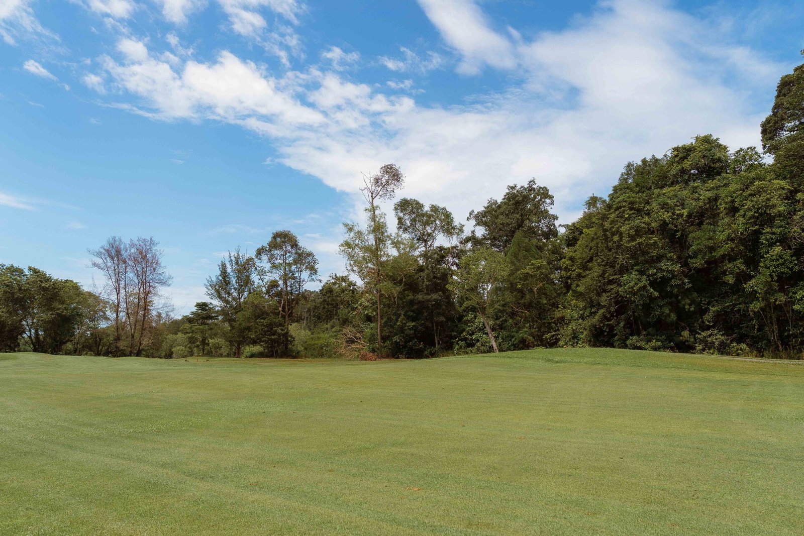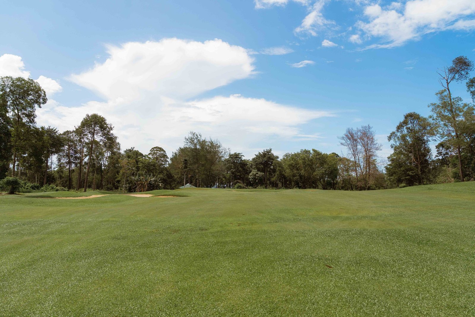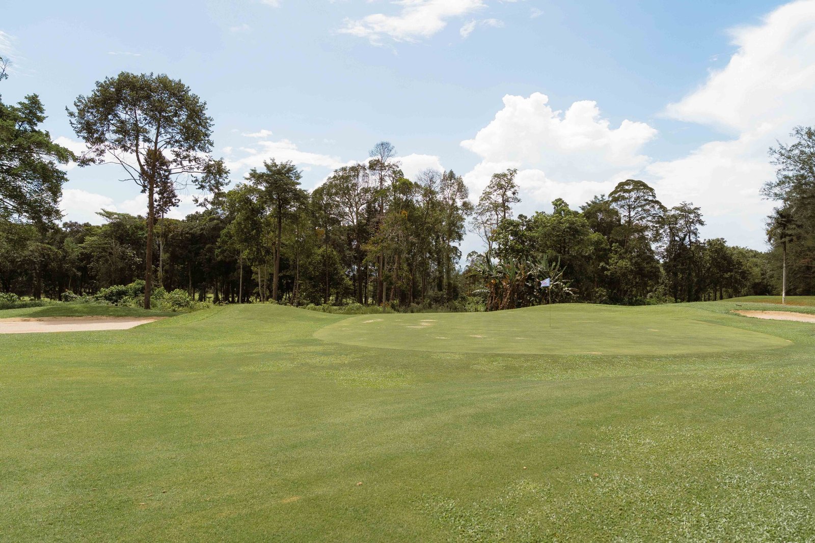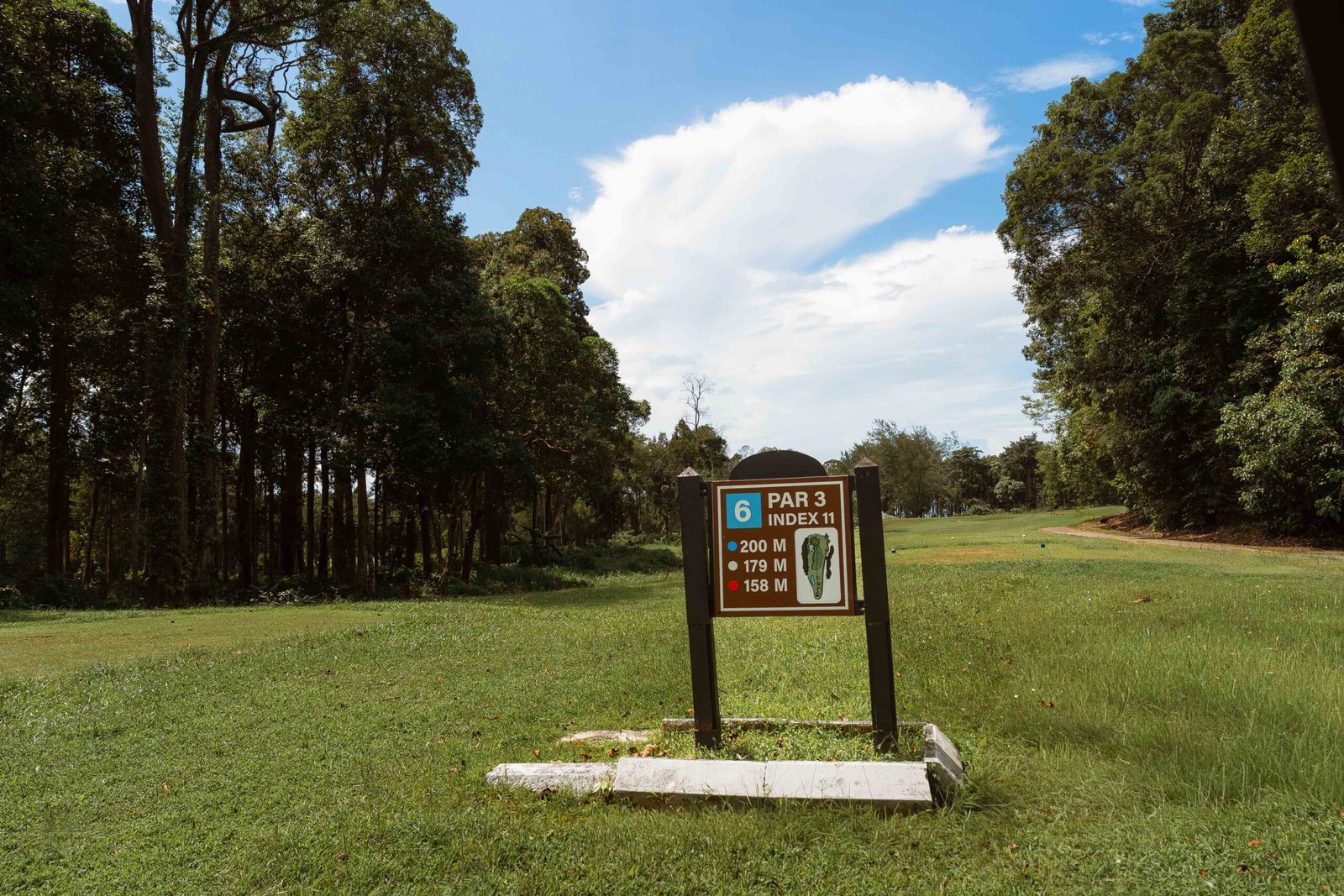 Set against the rugged mountain terrain, this long Par 3 demands a precise long-iron or wood. Water lines the left side of the hole, while the right is protected by a continuous OB boundary. The green is heavily fortified, featuring two bunkers at the front-left and one large bunker on the right. Club selection is critical for this 200m shot, as players must also navigate a cluster of trees guarding the back of the green.