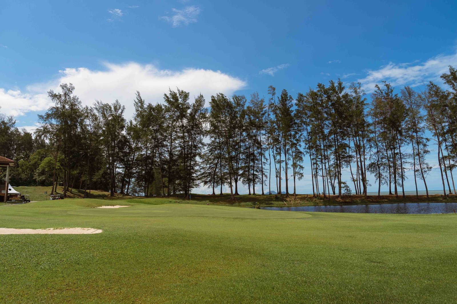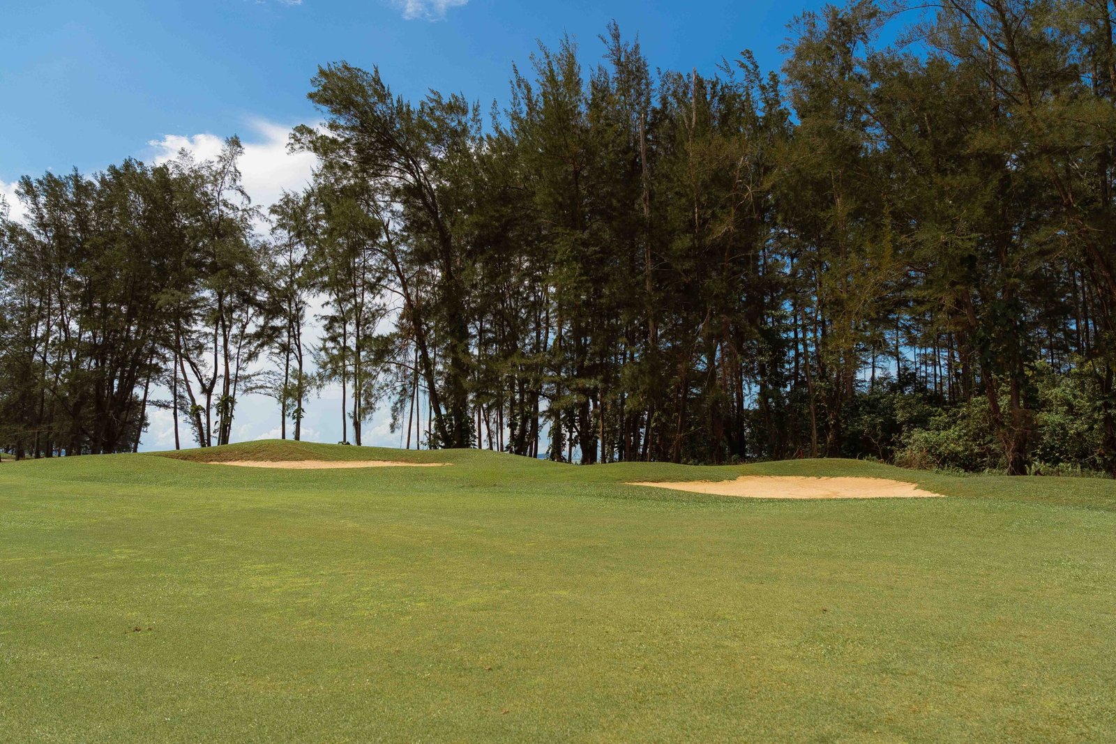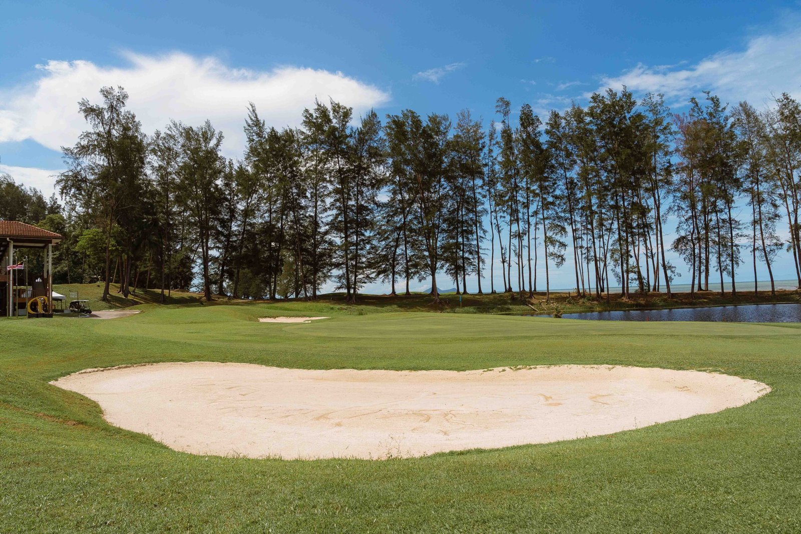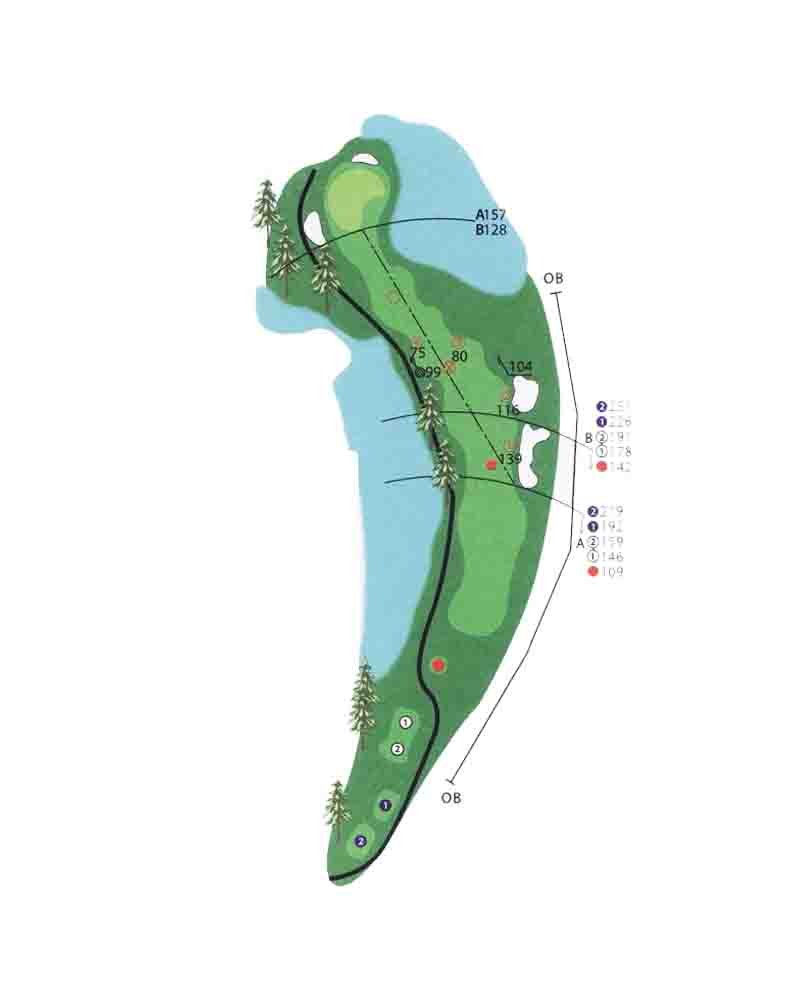 Completing the mountain loop, Hole 9 is a sweeping dogleg right. The drive must avoid the water hazard on the left and the OB line on the right. A strategic line of trees guards the corner of the dogleg, requiring a high-fading tee shot to reach the optimal landing zone. The approach into the final green is well-protected by a deep bunker on the right, ensuring a demanding finish to the front nine.