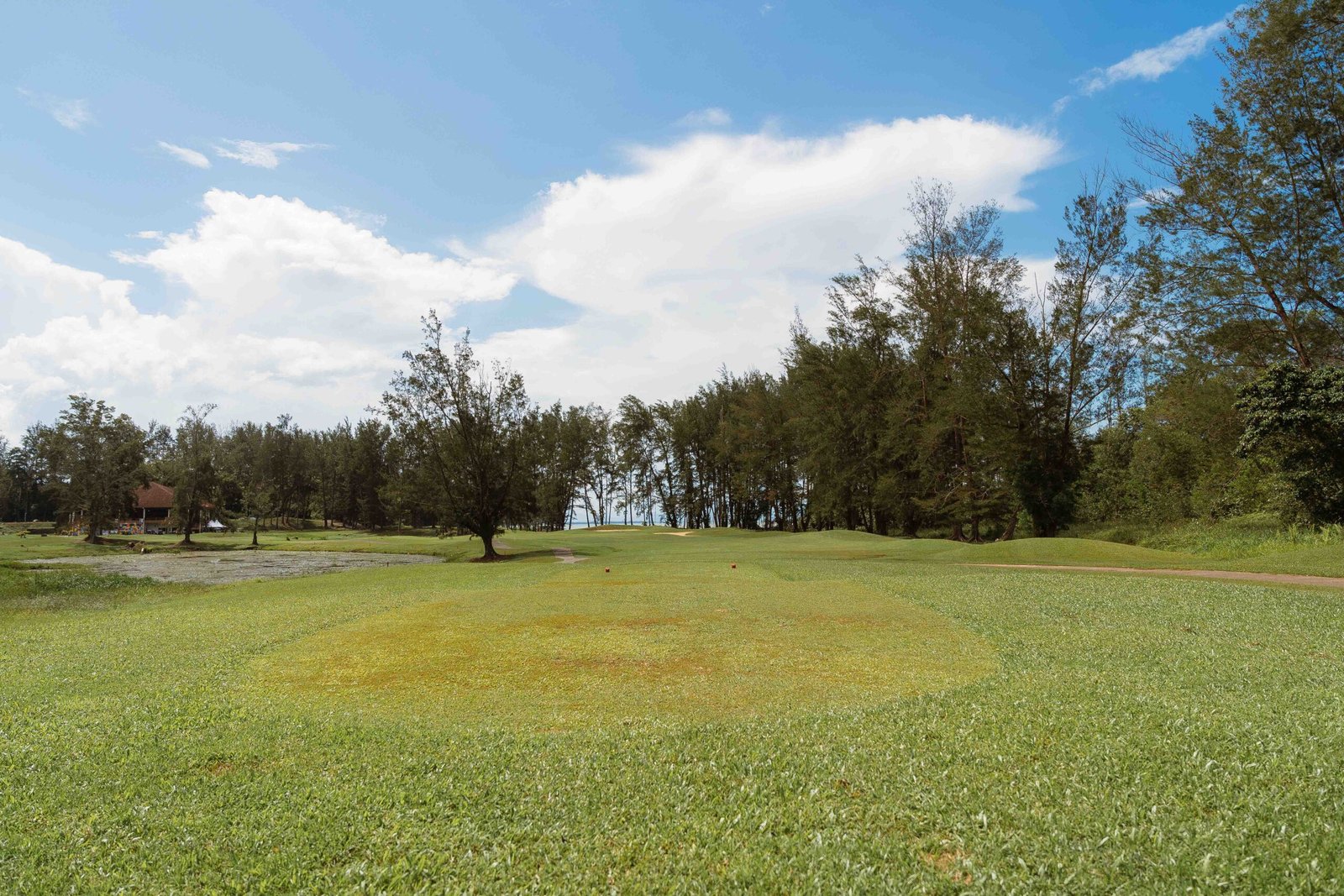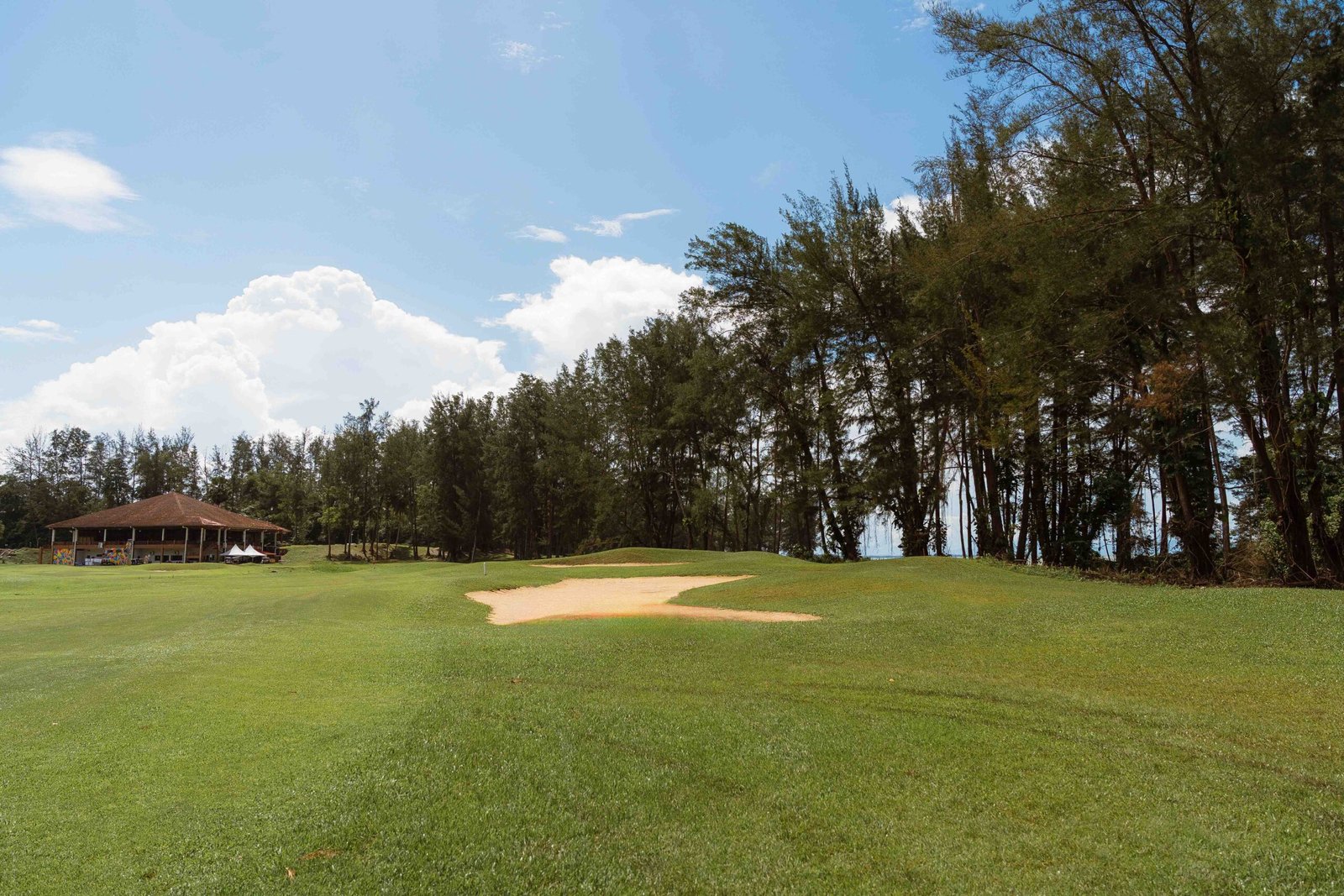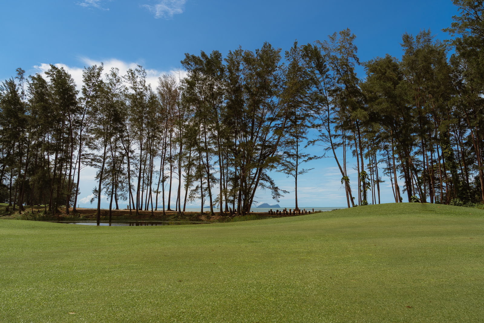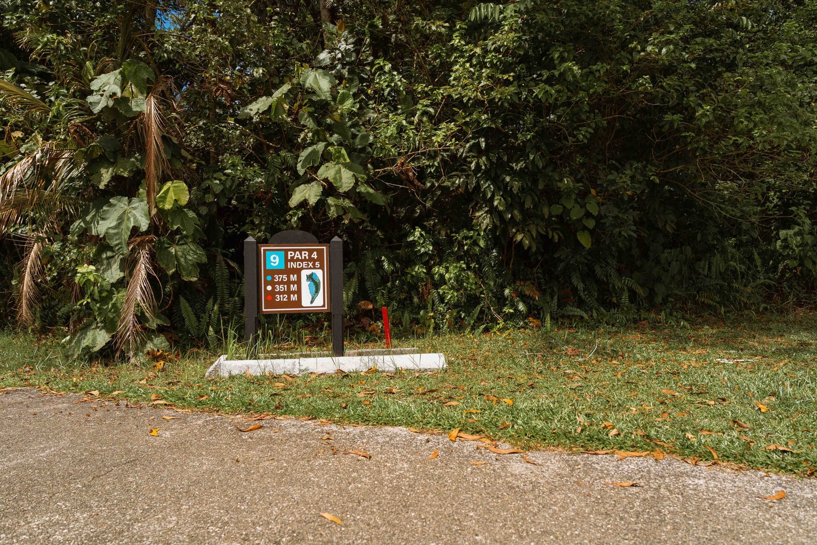 Completing the mountain loop, Hole 9 is a sweeping dogleg right. The drive must avoid the water hazard on the left and the OB line on the right. A strategic line of trees guards the corner of the dogleg, requiring a high-fading tee shot to reach the optimal landing zone. The approach into the final green is well-protected by a deep bunker on the right, ensuring a demanding finish to the front nine.